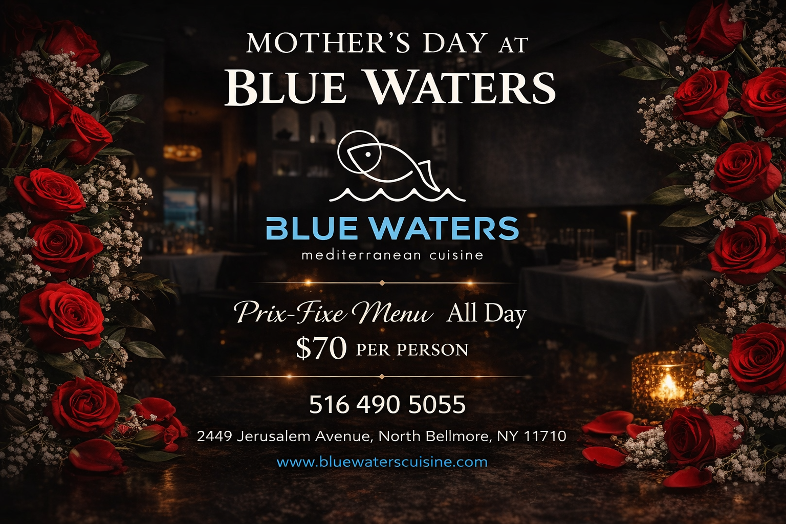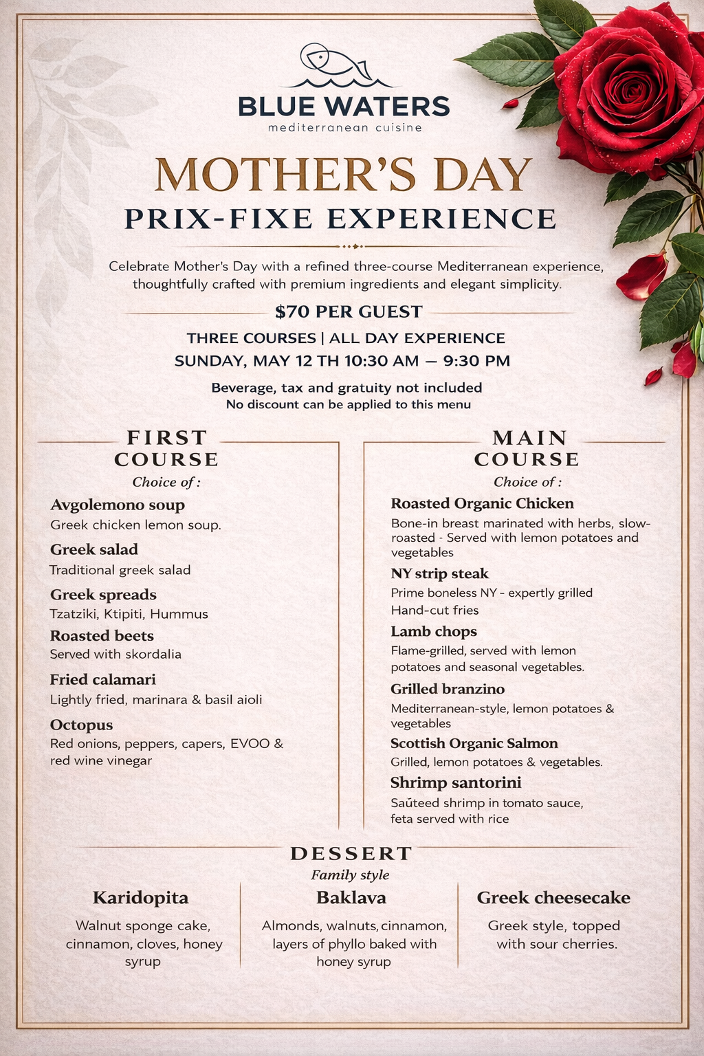 Celebrate Mother’s Day with an elegant dining experience at BLUE WATERS Mediterranean Cuisine, thoughtfully designed to honor the occasion with sophistication and warmth.